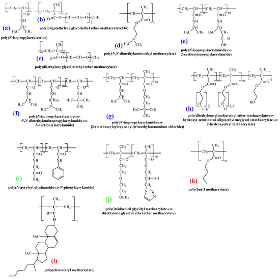 Chemical structures of TRPBCs for advanced biomedical applications. N-isopropylacrylamide (a), oligo(ethylene glycol)ethyl ether methacrylate with Mw = 246 (OEGMA246) (b), di(ethylene glycol)methyl ether methacrylate (c), N,N-dimethylaminoethyl methacrylate (d) and their copolymers with units from other functional monomers (e–h) poly(N-acryloyl glycinamide-co-N-phenylacrylamide) (i), poly(imidazoled glycidyl methacrylate-co-diethylene glycol methyl ether methacrylate) (j), poly(butyl methacrylate) (k) and poly(cholesteryl methacrylate) (l).