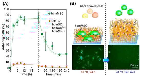 Adhesion and detachment profiles of human bone marrow mesenchymal stem cells (hbmMSC) and other human bone marrow-derived cells on poly(NIPAM-co-N,N-dimethylaminopropylacrylamide-co-N-tert-butylacrylamide) TRPBCs (A) and the mechanism of the separation of hbmMSC cells from other human bone marrow-derived cells (see text) (B) (with permission from [139]).