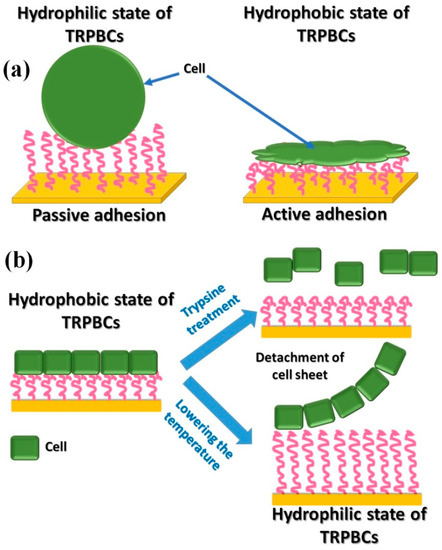 The damaged tissue of the patient can hypothetically be recovered by introducing the external cells or by implantation of the external tissue. However, the application of external cells to restore damaged tissue requires a long incubation time, whereas many of the introduced cells may lose their functions in a much shorter time. Therefore, the introduction of external tissues is a promising strategy for the restoration of damaged tissues. The most suitable approach for tissue engineering is cell sheet engineering employing TRPBCs. The main requirements for TRPBCs for advanced cell culturing and detachment are the following: perfect biocompatibility, high adhesion, proliferation and viability of the cells on the coatings, controlled and rapid cell or tissue detachment, appropriate transition temperature, and the ability for separation of the different cellular types. Application of the TRPBCs for temperature-modulated separation of the different cellular types is based on the adhesion and detachment of different types of cells on the same coatings, which is enabled by the change of physicochemical properties at different temperatures. This separation method is very important for various applications in biotechnology and biomedicine, because it is possible to not use reagents that damage and deactivate biological compounds, proteins, and cells.