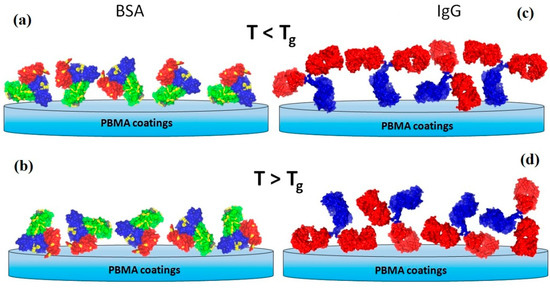 Advanced applications for temperature-controlled protein adsorption can be divided into two subcategories: temperature-controlled protein fouling/non-fouling or protein separation [22,23,24] and temperature-controlled protein orientation [25]. Controlling the interaction between surfaces and proteins in an aqueous environment is important for the prediction of the protein adsorption during the first step of surface fouling. Moreover, in recent years, temperature-controlled protein separation turned out to be a powerful method for separating a given protein from a protein mixture. The TRPBCs for advanced application as the temperature-controlled protein fouling/non-fouling materials should undergo the transition from a highly adsorbing state to a strongly non-fouling state in response to small changes in the temperature in the physiological environment. In addition, TRPBCs should be able to separate a single protein from the mixture of the proteins and trigger very rapid adsorption/desorption of the protein in response to small changes in temperature. Another approach is the advanced application of TRPBCs for temperature-controlled protein orientation. The orientation of proteins on the surface plays a crucial role in the binding of cell receptors and ultimately defines their targeting efficiency [26]. TRPBCs for temperature-controlled protein orientation, first, should not cause denaturation of the adsorbed proteins, and second, the temperature of the transition should be close to physiological (appropriate temperature).