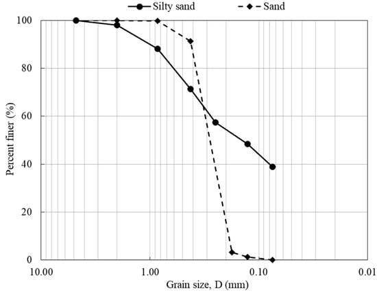 To investigate the effect of the soil type on the biopolymer-amended soil durability, two types of soil were investigated in this study: silty sand (SM), and poorly graded sand (SP). The soils were classified according to the following standards: ASTM D6913-17—Standard Test Methods for Particle-Size Distribution of Soils Using Sieve Analysis [], and ASTM D4318-17—Standard Test Methods for Liquid Limit, Plastic Limit, and Plasticity Index of Soils [].