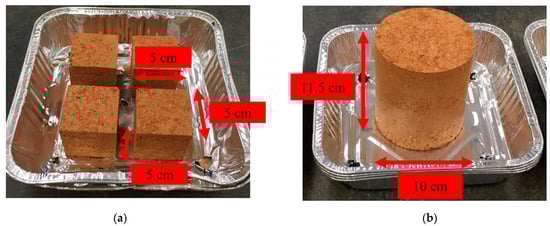 All specimens were air-dried in the laboratory at the temperature of 21 °C for five days (cubical specimens, Figure 2a) and seven days (cylindrical specimens, Figure 2b) to increase the biopolymer-soil strength and cure the specimens.