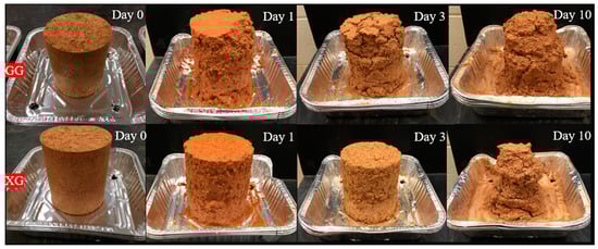 The durability testing during cyclic wetting and drying was performed by the guidance of the ASTM D559—Standard Test Methods for Wetting and Drying Compacted Soil-Cement Mixtures []. Since ASTM D559 was originally designated for cemented soil, this study introduced certain modifications to the procedure described in ASTM D559. After compaction and air-drying, we measured the mass of specimens and submerged them in water for one hour. The specimens’ mass was measured again after one hour, and specimens were placed in the oven at the temperature of 70 °C for 24 h. After 24 h, samples were taken out of the oven, gently stroked by a brush to remove all loose material, and weighed again before submerging them into the water. The same process was repeated ten times, where one hour in water and 24 h in the oven represents one wetting-drying cycle. This procedure was performed on XG-treated sand, XG-treated silty sand, and GG-treated silty sand. The cylindrical sand specimens with GG degraded after one hour in the water. Therefore, they could not be used for the continuation of the experiment. A similar degradation process happened with the cylindrical specimen of the plain silty sand. They degraded after one hour in the water. Thus, the durability testing of plain silty sand could not be continued.