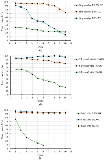 Interestingly, the silty sand with XG showed the best resistance for cyclic wetting and drying at a concentration of 1% XG (Figure 4a). At that concentration, the specimens kept most of the mass up to the sixth wetting-drying cycle. After that, the loss of mass was more noticeable. The same soil type with 0.5% and 2% XG lost more soil mass which indicates that 1% XG could be the optimal water-resistance concentration for this type of soil. There are two reasons behind this: the binding properties of XG and the absorptive properties of the composite material (silty sand and XG). XG is a glue-like binding agent that bridges soil particles. In the mixture with 0.5% XG, soil particles have a weaker biopolymer bond when compared with mixtures with 1 and 2% XG. Therefore, samples with 0.5% XG lost approximately 65% of their initial mass after the first wetting cycle. The plain specimens of silty sand had the weakest particle bond which is the reason they degraded after the first cycle. On the other hand, a question emerges concerning why samples with the highest XG concentration (2%) did not show the best water resistance. The reason for that is the aforementioned absorptive properties of silty sand and XG. The XG attracts and binds water molecules, which further increases the absorbing potential of already swelling plain soil. In other words, the higher presence of XG caused more trapped water. Therefore, to achieve the same water content after each drying for the specimens with 1 and 2% XG, specimens with 2% XG would require a higher drying temperature or longer drying time. The constant higher presence of water can cause the reduction of negative pore pressures that can lower the apparent cohesion and cause the degradation of the soil mass. That resulted in the faster degradation of specimens with 2% XG. However, the loss of the mass under all biopolymer concentrations was significantly reduced when compared with the loss in mass of the plain soil.