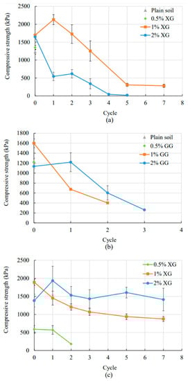 Figure 5c represents the change of the compressive strength of XG-treated sand with wetting-drying cycles. During seven cycles of wetting and drying, sand with 1% XG kept 46% of the initial strength, while the sand with 2% XG kept 75% of the initial strength. However, the biopolymer-amended sand samples did not sustain their shape and strength at the lowest biopolymer concentration. At the concentration of 0.5% XG, they lost 70% of the initial strength after the second cycle and completely degraded during the third cycle.