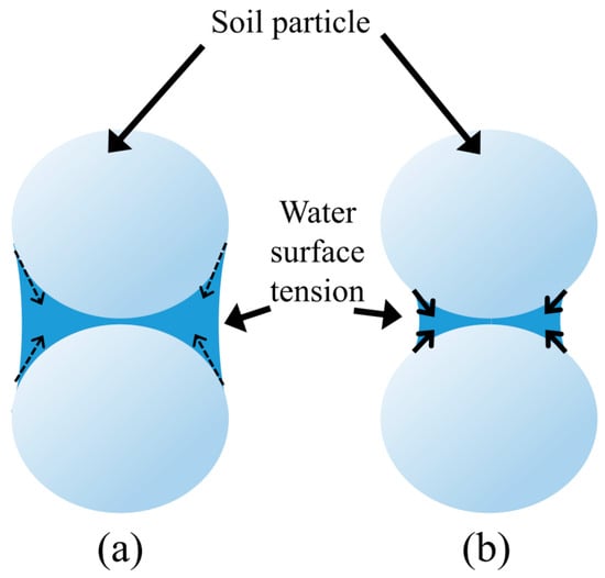 Interaction of water and soil particles: (a) a higher degree of saturation—lower surface tension forces, (b) lower degree of saturation—higher surface tension forces.