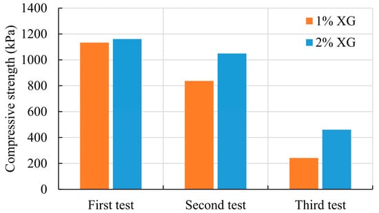 Xanthan Gum is one of the partially reversible bond-based biopolymers. That means that it can be brought to the previous state by reapplying the processes that initially induced the change of that state. That reversible nature of XG was examined in biopolymer-treated sand samples that were tested under the unconfined compression test. After the third wetting-drying cycle, that was used to investigate the change in the compressive strength. The broken specimens were used to investigate the healing properties of XG. The broken specimens were submerged for 20 min and dried in the oven for 48 h, as described previously. After that, the same specimens were tested again under the unconfined compression test. The same process was repeated one more time. The results of two XG-treated sand specimens are summarized in Figure 7. The repeated process of wetting-drying stiffened the soil-biopolymer bond, and the XG-treated sand specimen regained some level of the initial strength, which is presented in Figure 7. Higher magnitudes of the compressive strength and the level of the regained strength were achieved for the higher concentration of XG. That is not surprising since a higher concentration of XG causes faster and broader linking of XG molecules with each other and with the surrounding sand particles.