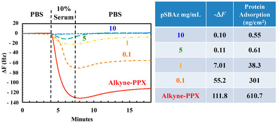 QCM analysis of protein adsorption from 10% fetal bovine serum to piezoelectric quartz disks modified with Alkyne-PPX and pSBAz at 0.1, 1, 5, or 10 mg/mL. 10% FBS flowed through the QCM chamber, followed by flowing PBS to remove unbound proteins until the frequency reached equilibrium. The amounts of adsorbed proteins were determined from frequency changes, according to the Sauerbrey equation.