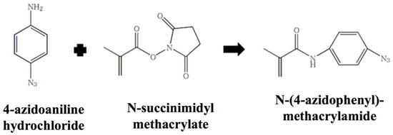 The synthetic scheme of N-(4-azidophenyl)methacrylamide is illustrated in Scheme 1, according to a previous procedure [27]. Briefly, 153.2 mg (0.9 mmol) 4-azidoaniline hydrochloride (Cat. No. 359556, Sigma-Aldrich, St. Louis, MO, USA) and 159 mg (1.5 mmol) sodium carbonate were dissolved in 35 mL of deionized water in the dark. 274.14 mg (1.5 mmol) N-succinimidyl methacrylate (Cat. No. 38862-25-8, Tokyo Chemical Industry, Japan) was dissolved in 3 mL of dioxane and then added to the 4-azidoaniline hydrochloride solution. The mixture was allowed to react at room temperature for 6 h in the dark under constant stirring. The product, N-(4-azidophenyl)methacrylamide (AzMA), was precipitated, filtrated, washed with deionized water, and then dried. The product was identified by 1H NMR (D-methanol, 500 MHz). The characteristic peaks of the hydrogen in the aromatic ring appear at 7.0 and 7.6 ppm (Supplementary Figure S1).