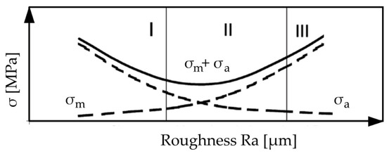 As the roughness increases, the value of the joining force might decrease (the adhesion decreases—zone II in Figure 1). In terms of large roughness, the mechanical hooking of surfaces increases in its contribution, which increases the stress appearing at the polymer–metal separation zone (σm) (zone IIII in Figure 1).