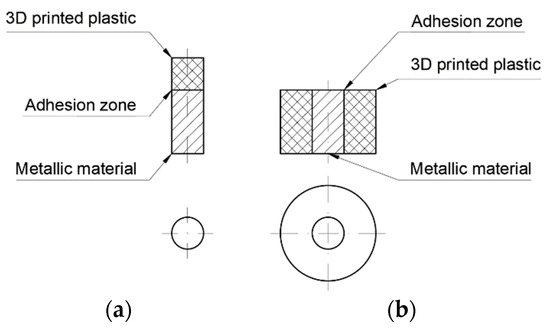 Figure 2. Geometric variants of the printing of metal–polymer components: (a) printing with a flat surface (simple method); (b) printing with a complex surface (method requiring software modifications). - (2)