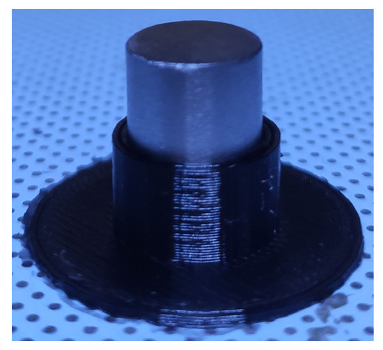 Prints were made using a Zortrax M300 Dual printer. The first attempts at printing consisted of printing a holder for a titanium alloy sample on the printer bed (Figure 3). Most 3D printer control programs allow the user to start depositing plastic at a selected height. In such cases, after entering the height of the sample, the printer will deposit the plastic to the metal without collision.
