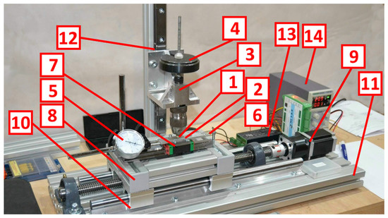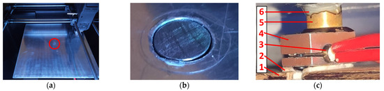 An aluminum alloy plate was mounted instead of the printer bed (Figure 4a). A hole was made in the center of the plate where the sample was placed (Figure 4b). The printer was equipped with a capacitive sensor and automatically adjusted the slope of the plate and its distance from the nozzle. Under the plate was a bar on which a heater with a sleeve holding the sample was located (Figure 4c). The aluminum alloy heating block contained the heater and temperature sensor. A sleeve holding the sample and transferring heat to it was placed on the block. A layer of epoxy resin was applied between the aluminum alloy plate and the sleeve to provide insulation and prevent the plate from receiving too much heat from the heater. The heater was controlled using a transistor. This allowed the heating block to be maintained at any temperature up to 260 °C with an accuracy of ±1 °C. The installation of the additional heater is a low-complexity, low-cost operation that requires components that are easily available.
