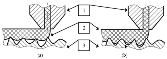 Application of the first layer: (a) standard flow; (b) increased flow; 1—printer nozzle; 2—first layer; 3—substrate.