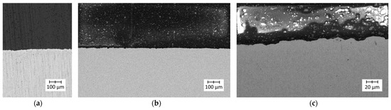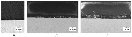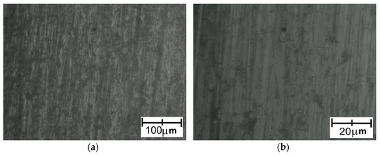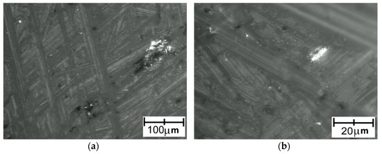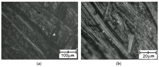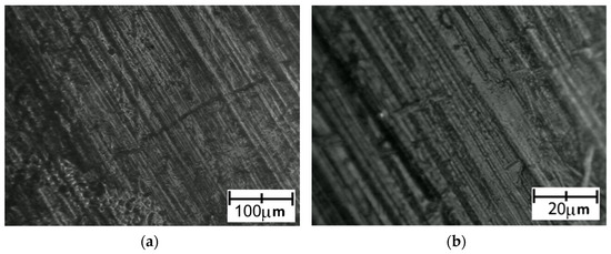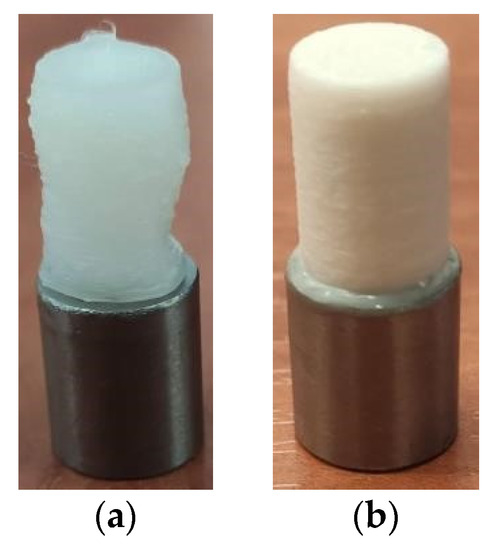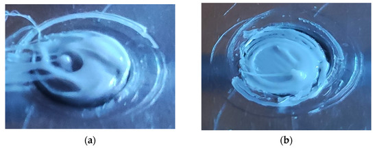 During attempts to deposit plastic on the titanium alloy, the authors took advantage of the experience from the research mentioned above. Unfortunately, when the flow was increased, the nozzle dragged the material. As a result, the initial layer on the sample surface was uneven and did not cover the entire metal surface (Figure 6a). Significantly better coverage was achieved with the standard flow (Figure 6b). When printing, the parameters recommended by Zortrax obtained from the software database were used. The only change was that the application speed of the first layer was reduced by 50% to reduce the drag of the plastic.