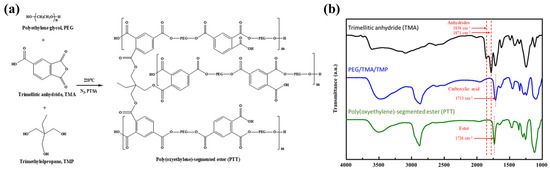 (a) Synthetic scheme for the branched polymer dispersant—Polyethylene glycol-trimethylolpropane-trimellitic anhydride (PTT). (b) FTIR spectrum analysis of the PTT polymeric dispersant.