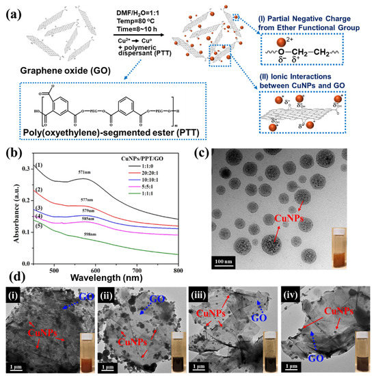 According to our previous research, the polymeric dispersant PTT can be synthesized using PEG1000, TMP, and TMA [47]. The design concept for the polymeric dispersant PTT involves utilizing the non-covalent bond between PEG and CuNPs on the main chain segment of the molecule to absorb the nanoparticles, and then perform an in situ reduction reaction [48]. During the synthesis reaction, Cu2+ can be converted to Cu0. Through noncovalent van der Waals force and ionic-charge interactions of the noncovalent bond, CuNPs can be stabilized by adsorption to the polymer. As a result of the non-covalent bonds between polymers, CuNPs and PTT exhibit excellent compatibility due to their mutual force. In addition, other forces—such as the interactions between the trimellitic anhydride group on TMA and the carboxyl, hydroxyl, and epoxy groups on GO—allow for CuNPs to adsorb onto the surface of GO. The complete reaction steps are presented in Figure 2a. Furthermore, GO can form an electrostatic attraction force with Cu2+ through the electronegativity of oxygen-containing functional groups on its surface. This force can adsorb copper ions on the surface of GO, thereby further reducing Cu2+ to achieve nanoscale stabilization of CuNPs. Further, the oxygen atoms within the branched polyester polymeric dispersant PTT can exert an interaction force with Cu2+ to allow further stabilization of the CuNPs/PTT/GO nano mixture solution. The UV-vis spectra of the samples following the reduction reaction are presented in Figure 2b. Upon reduction, the CuNPs exhibited a characteristic absorption peak at 570–590 nm of the UV-visible spectrum. Note that a peak will not appear at 570–590 nm if the reduction of CuNPs has not been completed. The increase in the peak intensity of curve (1) indicates that CuNPs have formed a particle state. In curves (2–5), the intensity of the absorption peaks decreased markedly as the concentration of GO increased. The results indicate that the surface of CuNPs was gradually covered by GO. At last, the absorption peak in curve (5) disappeared, indicating that PTT effectively adsorbed CuNPs onto the GO surface and formed CuNPs/PTT/GO. TEM was used to characterize the morphology and size of CuNPs/PTT/GO. Figure 2c shows the TEM and digital images of reduced CuNPs when mixed with PTT at a ratio of 1:1 and without GO. As can be seen in the digital image, the CuNPs/PTT solution appeared reddish-brown without GO. The TEM image shows that PTT caused CuNPs to be spherical, and the PTT coating on the surface of the CuNPs can be seen clearly. The effects of ratios of CuNPs/PTT/GO being (i) 20:20:1, (ii) 10:10:1, (iii) 5:5:1, and (iv) 1:1:1 on the stability of CuNPs and the corresponding digital images are presented in Figure 2d. As the proportion of GO increased, it was observed that the number of CuNPs on the surface of GO gradually decreased, and the size of the 2D GO flake was 3–5 μm. In the absence of GO, relatively large particles of CuNPs, with an average size of 35–100 nm, were produced. With the addition of GO, the average particle size of CuNPs was reduced to approximately 10–35 nm. CuNPs were also observed to be arranged between the GO layers, forming a CuNPs/PTT/GO material with a good 3D structure. The digital images of solutions showed that the GO-containing PTT appeared dark red after being reduced with NaBH4. It was noted that each sample displayed a slightly different color, which may be due to the particle size of CuNPs when reduced under different conditions. The digital images of the samples before reduction are presented in Figure 3. As can be seen, when Cu(CH3COO)2·H2O was dissolved in DMF and H2O (w/w = 1:1), the solution appeared light blue. In this observation, it is again demonstrated that Cu2+ was successfully reduced to Cu0 following the reduction by NaBH4.