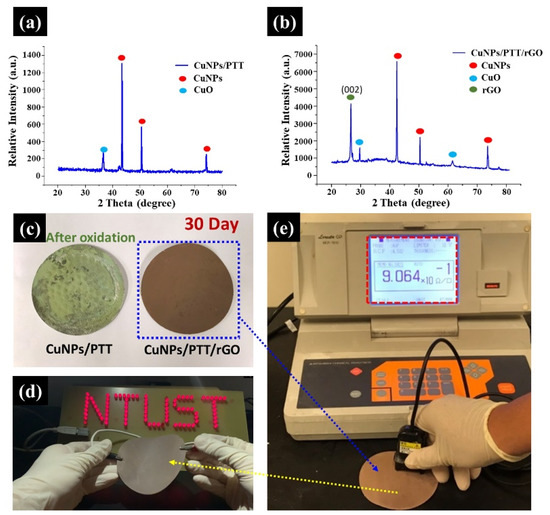 XRD analysis of (a) CuNPs/PTT. (b) CuNPs/PTT/GO hybrid. (c) Digital photos of oxidized CuNPs/PTT and non-oxidized CuNPs/PTT/GO films after 30 days of air exposure. (d) The sheet resistance of the CuNPs/PTT/GO film was measured after 30 days of air exposure. (e) The LED circuit test of the CuNPs/PTT/GO film demonstrated excellent electrical conductivity.