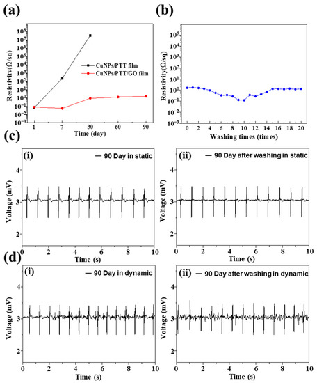 (a) The resistance values of CuNPs/PTT film and CuNPs/PTT/GO film for different days, (b) The resistance value of CuNPs/PTT/GO film after different times of washing test. (c) Static ECG and (d) Dynamic ECG signals where (i) before washing test and (ii) after 20 times wash cycles of CuNPs/PTT/GO film electrodes, respectively.
