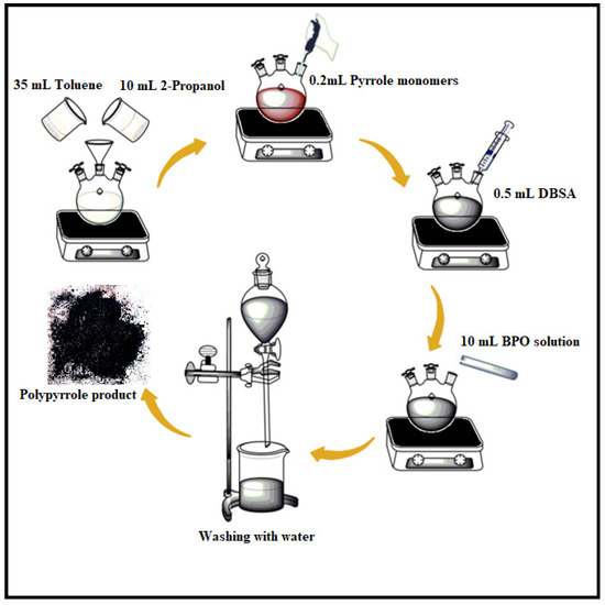 PPy was synthesized by using a pyrrole monomer via inverse emulsion polymerization. The procedure was carried out in a three-necked round bottom flask holding 35 mL toluene and 10 mL 2-propanol that was stirred for 15 min. After that, 200 μL of pyrrole was added and stirred for another 15 min, followed by drop wise addition of 0.5 mL of DBSA and 0.303 g of benzoyl peroxide (dissolved in 5 mL of water) to the reaction mixture. To get the precipitate, the mixture was vigorously stirred for 24 h. The precipitate was washed three times with distilled water and 50 mL of acetone to separate the pure product that was dried in an oven at 50 °C for 24 h. The representative procedure of the synthesis of polypyrrole has been sketched in Figure 1.