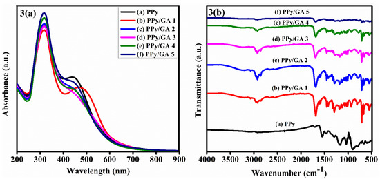 Figure 3a shows the UV-visible spectra of pure PPy and PPy/GA composites. Two significant absorption peaks can be seen in the spectra. At 312–319 nm and 445–480 nm, the first and second absorption peaks were found, respectively. The transition of electrons from the lowest occupied molecular orbital (LOMO) to the highest unoccupied molecular orbital (HUMO), which corresponds to the π–π* electronic transition of the aromatic ring in the polymer chain, is responsible for the first absorption band [25]. The sum of polarons and bipolarons is assigned to the second absorption band, which serves to determine that the PPy component of the composites is made up of free carriers (mainly polarons) [26], suggesting the CPs in their oxidized and conducting state [27]. The difference in peak intensities is related to the difference in composite concentration in the solvent, whereas the difference in peak position is due to the length of the polymer chain. There is a change in the absorption spectra when GA is added to the PPy matrix. The first absorption band exhibited a small rise as GA concentrations increased. Both intensity and peak shifting were detected in the second absorption peak. The absorption peak for PPy/GA 1 shifts toward a longer wavelength (red shift). The shift of peaks towards lower wavelengths was noted in the PPy/GA 2 through PPy/GA 5 composites. The absorption shift is caused by the blocking of ions or free radicals or the active site of the PPy by GA.