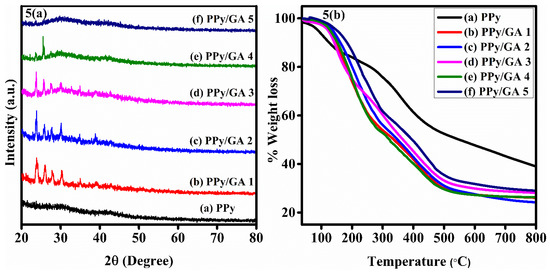 D stands for the average crystallite size, while k stands for the dimensionless shape factor, which has a value of 0.9, which is close to unity. It varies depending upon the crystallite’s shape, λ is the wavelength of X-ray that was used, and β is the angle of diffraction at full width and at half maximum. PPy has a crystallite size of 0.627 nm. Peaks were found at 2θ = 23.82°, 25.97°, 27.57°, 30.41°, and 34.99° in the PPy/GA 1 composite as shown in Figure 5a. The PPy/GA composites are partially amorphous and also partially crystalline in nature. The sharp and narrow peaks show the crystalline nature of the composites, whereas the halo and broad peaks show the amorphous nature of the composites. According to the previous discussion, increasing the quantity of GA in the composites to PPy/GA 2, where the amount of GA is 0.25 percent, enhances the crystallinity of PPy [40]. By further increasing the amount of GA in the composite materials, the composites become less crystalline at PPy/GA 5. GA is mostly amorphous in nature. The crystallinity of PPy/GA 1 increases due to the formation of composites of GA with PPy, which is not an unexpected result. However, at higher concentration of GA in the composites (PPy/GA 5) the amorphous nature becomes dominant as clearly seen in Figure 5a, which is attributed to the mostly amorphous nature of GA.