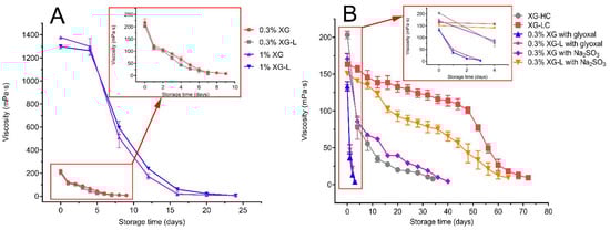As seen in Figure 2A, the thermal stability of XG-L was not improved compared with XG, at two concentrations (1% and 0.3%). No significant difference in the storage time required to lose viscosity was found between XG and XG-L samples.