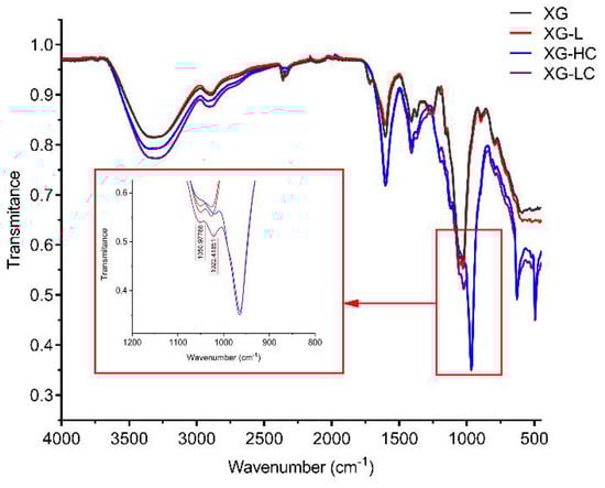 Fourier-transform infrared spectra of XG, XG-L, XG-HC, and XG-LC. XG, natural xanthan gum; XG-L, pyruvate-free xanthan gum; XG-HC, natural xanthan gum with a deoxidizer and glyoxal added; XG-LC pyruvate-free xanthan gum with a deoxidizer and glyoxal added.