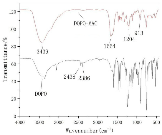 The infrared spectra of the vacuum-drying product were measured by FT-IR spectrometer. The infrared spectra were as showed in Figure 2. As seen in Figure 2, some typical characteristic peaks such as P-H (2438 and 2386 cm−1), P = O (1204 cm−1) and P-O (914 cm−1) appeared in DOPO spectra [25]. For DOPO-MAC, P = O and P-O peaks still existed, while the P-H stretching vibration peak disappeared, which indicated the reaction between DOPO and MAC [26]. The absorbance peaks at 3439 and 1664 cm−1 were N-H and C = O stretching vibration, respectively.