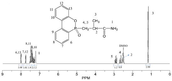 A total of 0.01 mol DOPO, 0.01 mol methyl acrylamide and 10 mL DMF (as the solvent) were firstly added into a three-necked flask with a thermometer, reflux device and magnetic stirring device, and kept stirring until completely dissolved. Afterwards, the mixtures continued to stir at 140 °C for 4–8 h under N2. At the end of the reaction, the final product was obtained through filtration, washed with water and dried at in a vacuum drying cabinet at 60 °C for 10 h. The synthetic route is shown in Figure 1.