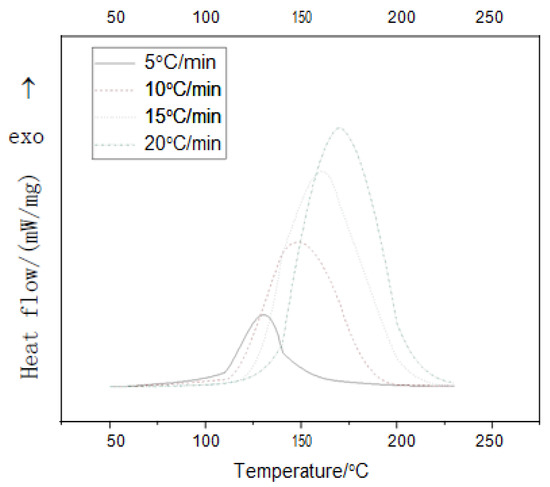 DSC Test: A DSC200F3 differential scanning calorimeter manufactured by Netcom Scientific Instruments (Shanghai, China) Co., Ltd. was used in the non-isothermal DSC test. A few samples were put into the furnace in a high-purity N2 atmosphere, and the flow rate was kept at 20 mL/min. Al2O3 was the reference material, and the heating rates were set at 5 °C/min, 10 °C/min, 15 °C/min and 20 °C/min, respectively. The test temperature ranged from room temperature to 250 °C, and the sample dosage was about 8 mg.