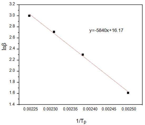 We obtained a straight line by plotting ln β—(1⁄Tp) (see Figure 7) and making linear regression. The Ea of 46.15 kJ/mol of the curing reaction can be obtained from the slope of the line.