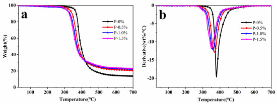 The thermal stability of the resin system was further studied by thermogravimetric analysis (TGA). As shown in Figure 8, the thermal weight loss curve of samples having phosphorus content from 0% to 1.5% for epoxy resin system was measured in the atmosphere of N2, the initial thermal decomposition temperature (T5%) of four different resin systems was recorded according to the thermal weight loss curve, and the maximum thermal decomposition temperature (Tmax) and the residual mass were recorded as shown in Table 4.