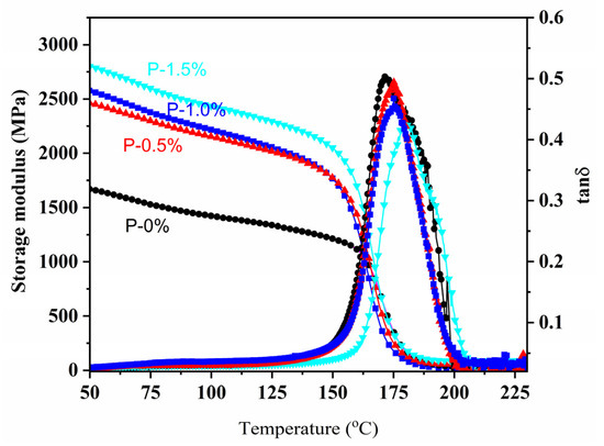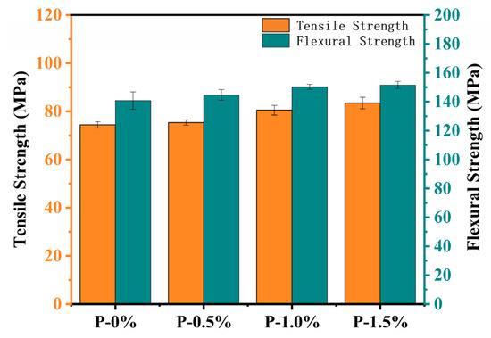Figure 10 shows the tensile and flexural properties of all the cured resins. Both the tensile strength and modulus were increased with the addition of DOPO-MAC. P-0% system showed an average tensile strength of 74.3 MPa. For P-0.5%, P-1.0% and P-1.5%, their tensile strength was 75.4, 80.5 and 83.5 MPa, respectively. Their flexural performances presented Figure 10 also illustrated almost the same variation trend as the tensile properties. From P-0% to P-1.0%, a slightly increment in flexural strength was observed, which should be attributed to the compatibility and higher rigidity of systems containing DOPO-MAC.