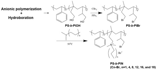 Compared to homopolymers and random copolymers, block copolymers are more advantageous in controlling the microstructures, which are not well discussed in most homo or random copolymer literature. The antibacterial activity relates to the morphology in solution. By varying the lengths of the constituent blocks or ratio of the amphiphilic blocks, block copolymer could be transformed into a designated molecular structure [26]. Kenichi Kuroda et al. have reported that the block and random copolymers with similar polymer lengths and monomer compositions display the same level of bactericidal activity, but the block copolymers display selective activity against E. coli over red blood cells (RBCs) [27]. In a previous study, we synthesized a polystyrene-block-quaternized polyisoprene amphipathic block copolymer, denoted as PS-b-PIN for alkaline direct methanol fuel cells [28]. PS-b-PIN is amphiphilic block copolymer composed of a hydrophobic polystyrene (PS) segment and a quaternized polyisoprene (PIN) segment bearing pendant quaternary ammonium groups attached to the polyisoprene backbone via alkyl spacers. Since PS-b-PIN is amphiphilic block copolymer and contains many of quaternized side chains, it can be used as an antibacterial agent. Herein, we assembled the prepared PS-b-PIN with different long side chains into large polymersomes in the buffer solution to serve as antibacterial agents. Through precise synthesis of block copolymer, the antimicrobial activities can be controlled and polymer morphology manipulated to examine the relationship between them.