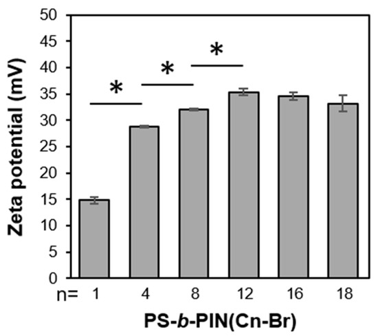 The zeta potential of PS-b-PIN with different side chain length. *: p < 0.05.