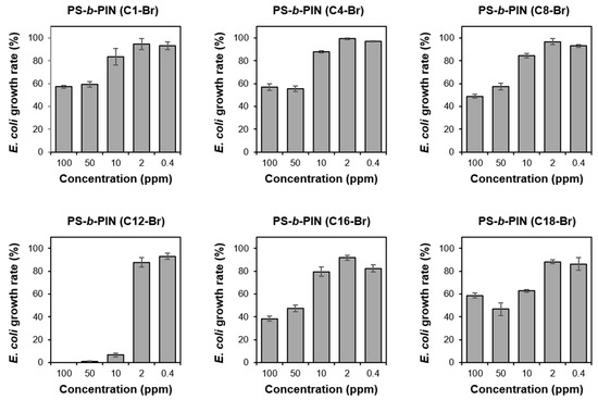 In order to test the effect of side chain length of PS-b-PIN on inhibition of bacterial growth, the prepared PS-b-PIN (C1-Br), PS-b-PIN (C4-Br), PS-b-PIN (C8-Br), PS-b-PIN (C12-Br), PS-b-PIN (C16-Br), and PS-b-PIN (C18-Br) at the concentrations of 0.4, 2, 10, 50, and 100 ppm were incubated with E. coli for 16 h. The results of E. coli growth rate shown in Figure 3 reveal that there was a positive relationship between the bacterial growth rate and PS-b-PIN concentration. Moreover, the antibacterial effect of PS-b-PIN increased as the length side chain increased. However, the PS-b-PIN with N,N-dimethyldodecylamine as a side chain could achieve a better antibacterial effect due to the higher surface charge density, which could lead to ionic interaction with bacteria wall constituents and disruption of the cell bacteria membrane to cause bacterial death [29,30]. However, the PS-b-PIN with longer side chain length (C16-Br and C18-Br) could not exhibit an effective inhibition on the E. coli growth. It could be suggested that more flexible long carbon side chain would form intramolecular aggregates to reduce the active polymer chains, resulting in the lower antibacterial activity. Since the PS-b-PIN (C12-Br) had best effect on inhibiting bacterial growth, we decided to use this kind PS-b-PIN block copolymer sample for the following tests.