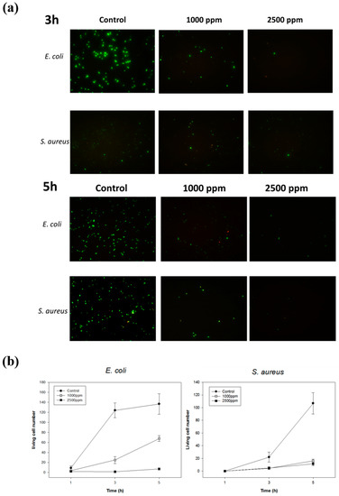 To investigate the antibactericidal ability of PS-b-PIN against both Gram-negative and Gram-positive bacteria, 1 × 105 CFU/mL of bacteria were directly mixed with PS-b-PIN under orbital shaker incubator at 37 °C. In order to examine the antibacterial mechanism of PS-b-PIN, the bacteria number with different treatment were assayed at the incubation time of 3 and 5 h (Figure 4). Since PS-b-PIN has an absorption background at 600 nm under tested concentration, Live/Dead fluorescence assays were used. After 3 h of incubation, the number of E. coli was lower for control and PS-b-PIN treated groups. This was due to the lag phase of bacterial growth in which the number increase of bacteria was merely assayed. After 5 h incubation, E. coli started to grow in log phase and an obvious number increase was observed for the control group. In contrast, growth of E. coli was clearly inhibited by mixing with PS-b-PIN within a 5 h incubation. Similar growth tendency was also observed for S. aureus. At the concentration of 2500 ppm, the prepared PS-b-PIN against E. coli was more efficient than that against S. aureus. This greater antimicrobial efficiency might be attributed to the thickness of bacterial wall. The cell wall thickness of Gram-negative bacteria E. coli is around 7–8 nm, which was thinner and consequently more susceptible than that of Gram-positive bacteria S. aureus (20–80 nm) [31]. These results demonstrated that PS-b-PIN has antibacterial activity against not only Gram-negative but also Gram-positive bacteria in the short treating time.