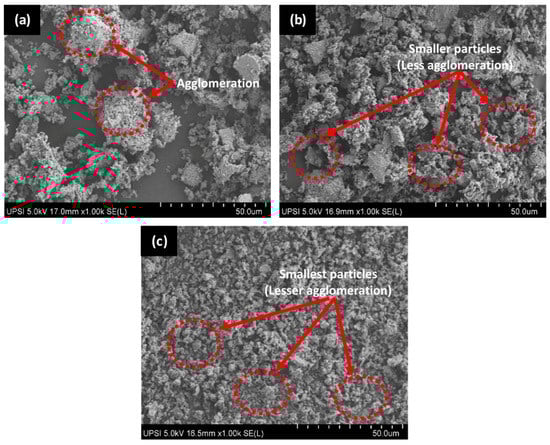 Scanning electron microscopy (SEM) images of HAp powder from (a) main chamber (MC) (b) secondary chamber (SC1), and (c) secondary chamber (SC2).