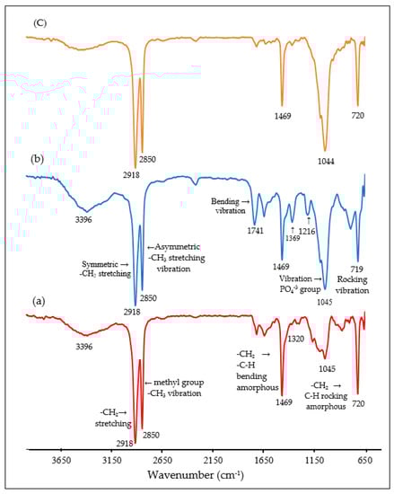 Fourier transform infrared (FTIR) spectra of (a) Pure HDPE, (b) Untreated HDPE/30HAp composite, and (c) Treated HDPE/30HAp-S composite.