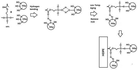 Schematic diagram representing the possible interaction mechanism reaction of silane coupling agent (MPS) interlinked with HAp surface treatment and HDPE matrix.