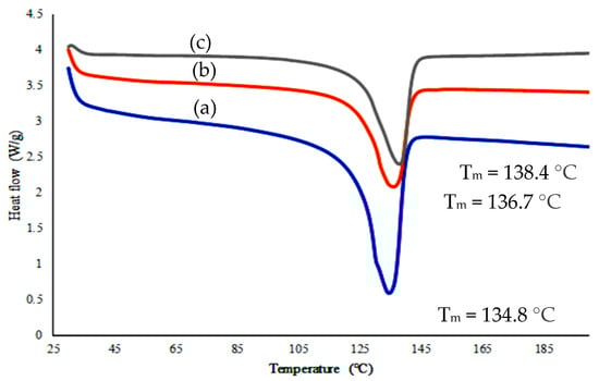 Differential scanning calorimetry (DSC) analyses were carried out to study the influence of filler loading and silane-treated filler on the melting point of HDPE/HAp composite. Figure 4 shows the melting peak of pure HDPE and its composites, evidencing that there is significant variation in their position. The melting point (Tm) of pure HDPE of 134.8 °C was shifted to 136.7 °C after loading with 30 wt. % HAp. Meanwhile, the melting point of silane-treated composite was shifted to 138.4 °C. This increase could be attributed to the ability of natural HAp in increasing surface interaction between the HDPE matrix and the silane in increasing the HAp–HDPE interfacial bond. This is an agreement with FTIR results which showed spectrum peak changes indicated some degree of chemical interaction between HAp and the matrix.