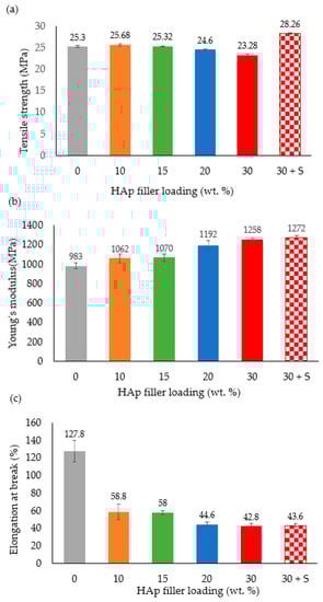Effects of HAp filler on (a) tensile strength, (b) Young’s modulus, and (c) elongation at break of the HDPE/HAp composites.