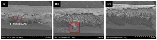 The microstructural characterization was performed using the SEM to analyze the fracture behavior of the pure HDPE and HDPE/HAp composites subjected to tensile loading as shown in Figure 6. The pure HDPE as shown in Figure 6a exhibits a ductile fracture behavior with a fibrous appearance of the polymer on the fracture surface (red marked region) which indicates a significant level of plastic deformation common to most polymer materials. Whereas, with the introduction of the HAp filler, the fracture morphology transited to a brittle-type failure (Figure 6b) which supports the relatively high reduction in the elongation at break of the HDPE/HAp composites (Figure 5c). Similar to the the HDPE/30HAp, the silane-treated counterpart also exhibited a brittle failure. However, the fracture surface of the HDPE/30HAp-S exhibits a planar morphology (Figure 6c) relative to the undulating morphology of the HDPE/30HAp counterpart (marked region of Figure 6b), indicating that the silane-treated composite exhibits better filler-matrix adhesion level. Exceptional interfacial bonding offers mechanical interlocking at the filler-matrix interface hence, the superior tensile strength and stiffness demonstrated by the HDPE/30HAp-S composite.
