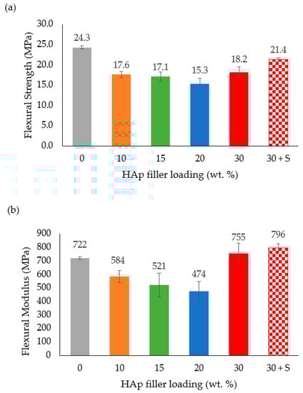 The flexural strength of the HDPE/HAp composites as a function of HAp filler loading is presented in Figure 7a. It can be observed that the flexural strength decreased linearly with increasing filler loading up to the 20 wt. % HAp mark. The reason for this trend can best be substantiated by the findings of Ohgaki et al. [] and Damadzadeh et al. []. Based on these investigations, flexural strength of the composites declined due to insufficient adhesion of the HAp filler particles to the polymer matrix and, as a result, the stress did not intensify at the HAp–polymer interface. Meanwhile, the HDPE/30HAp-S composite exhibited improved flexural strength as compared to the untreated counterpart which is in agreement with the discussion presented for the tensile properties.