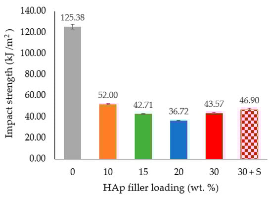 The impact strength values for the HDPE/HAp composites at different HAp filler loadings are presented in Figure 8. As seen in the figure, the impact strength dropped drastically from 125.38 KJ/m2 for the pure HDPE to 52 KJ/m2 after the addition of a small amount (10 wt. %) of HAp filler loading. Moreover, beyond the 20 wt. % mark of the HAp filler loading, the impact strengths of the HDPE/30HAp and HDPE/30HAp-S composites slightly increased to 43.57 KJ/m2 and 46.9 KJ/m2, respectively. The introduction of hard HAp filler hardened and disrupted the continuity of the HDPE matrix, thus restricting the capacity of the matrix to dissipate the applied impact energy. This submission is consistent with findings presented elsewhere [] on HDPE/eggshell HAp composites.
