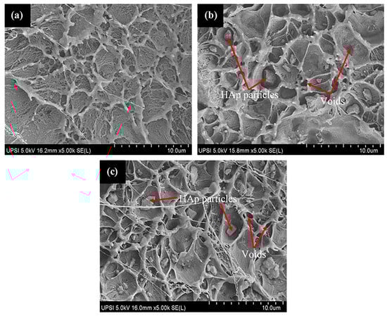 Contrary to the HDPE/30HAp composite, the silane-treated counterpart (HDPE/30HAp-S) demonstrated the highest tensile strength across the board. The enhancement in the tensile strength of the HDPE/30HAp-S composite can be attributed to the improved bonding between the HAp filler and the HDPE matrix. This improvement led to efficient stress transfer from the matrix to the filler through the filler–matrix interface and concurrent increase in tensile strength. The result can be further substantiated using a complementary study elsewhere [], where the MPS silane coupling agent increased the wetting and wrapping of the HAp particles in the HDPE matrix. This phenomenon has been confirmed in the SEM analysis presented later in the section.