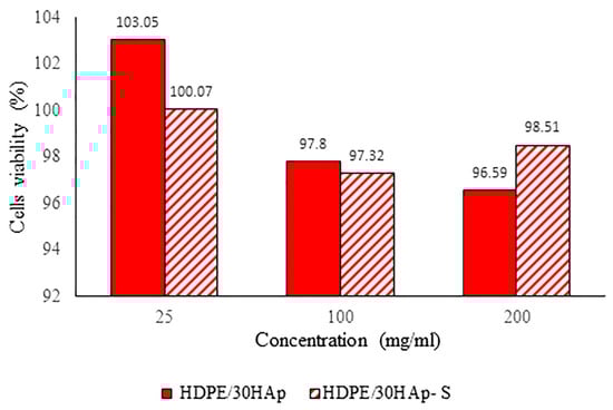 The result of the cell viability at different concentrations of sample extract is shown in Figure 10. As seen from the figure, the overall results demonstrated that both the treated and untreated HDPE/HAp composites are biocompatible since the cells exposed to 24 h of extract recorded cell viability values higher than 80% for all the tested concentrations. The finding above is consistent with the study of Liu et al. [] in which it was reported that the cell viability was approximately 100% after 24 h of co-culture, hence indicating excellent biocompatibility of the HDPE/HAp composite. Therefore, it can be concluded that both composites are biocompatible and suitable for biomedical application.