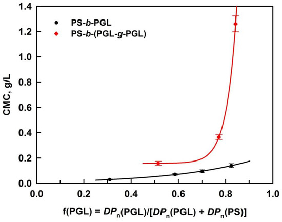 2.3.5. Determination of CMC, Hydrodynamic Diameters of PS-b-(PGL-g-PGL) Particles, and Diameter Dispersity Values by the Dynamic Light Scattering (DLS) Method