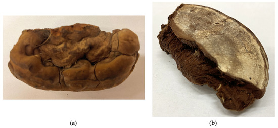Dried and homogenized basidiocarp from the fungus Ganoderma resinaceum was found in the town park in Kralupy nad Vltavou, Middle Bohemian region, Czech Republic. This basidiocarp (Figure 1a,b) was identified by Dr. Michal Tomšovský (Mendel University in Brno, Czech Republic), who is a specialist in mycology of forest wood decay fungi, and the specimen was deposited in the Herbarium of Moravian Museum (BRNM), Brno, Czech Republic. This raw material was dried in air and homogenized to a particle size of 0.5 mm using the IKA homogenizer (IKA Werke, Staufen, Germany).